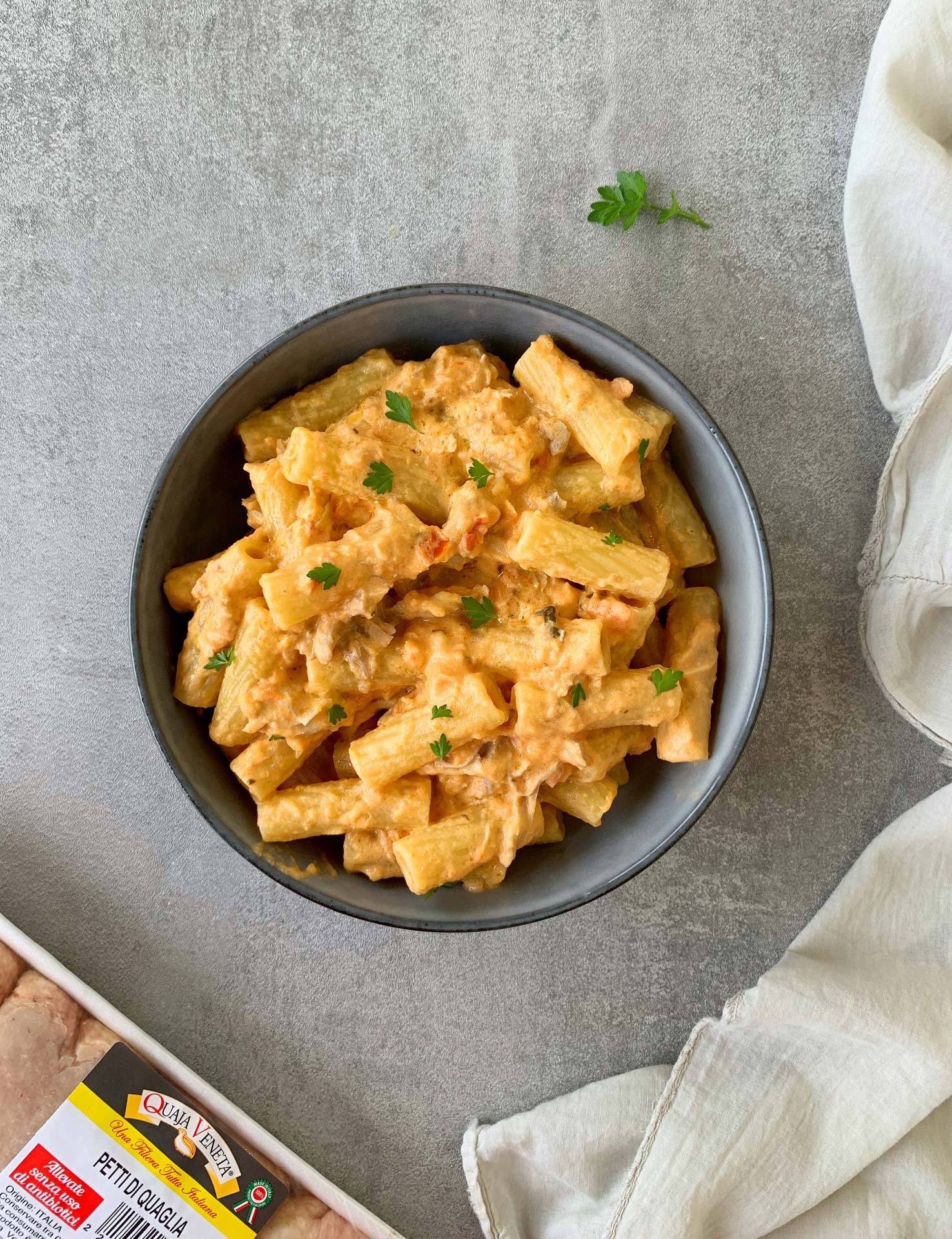 Cremige Tomatennudeln mit Wachtel-Ragout