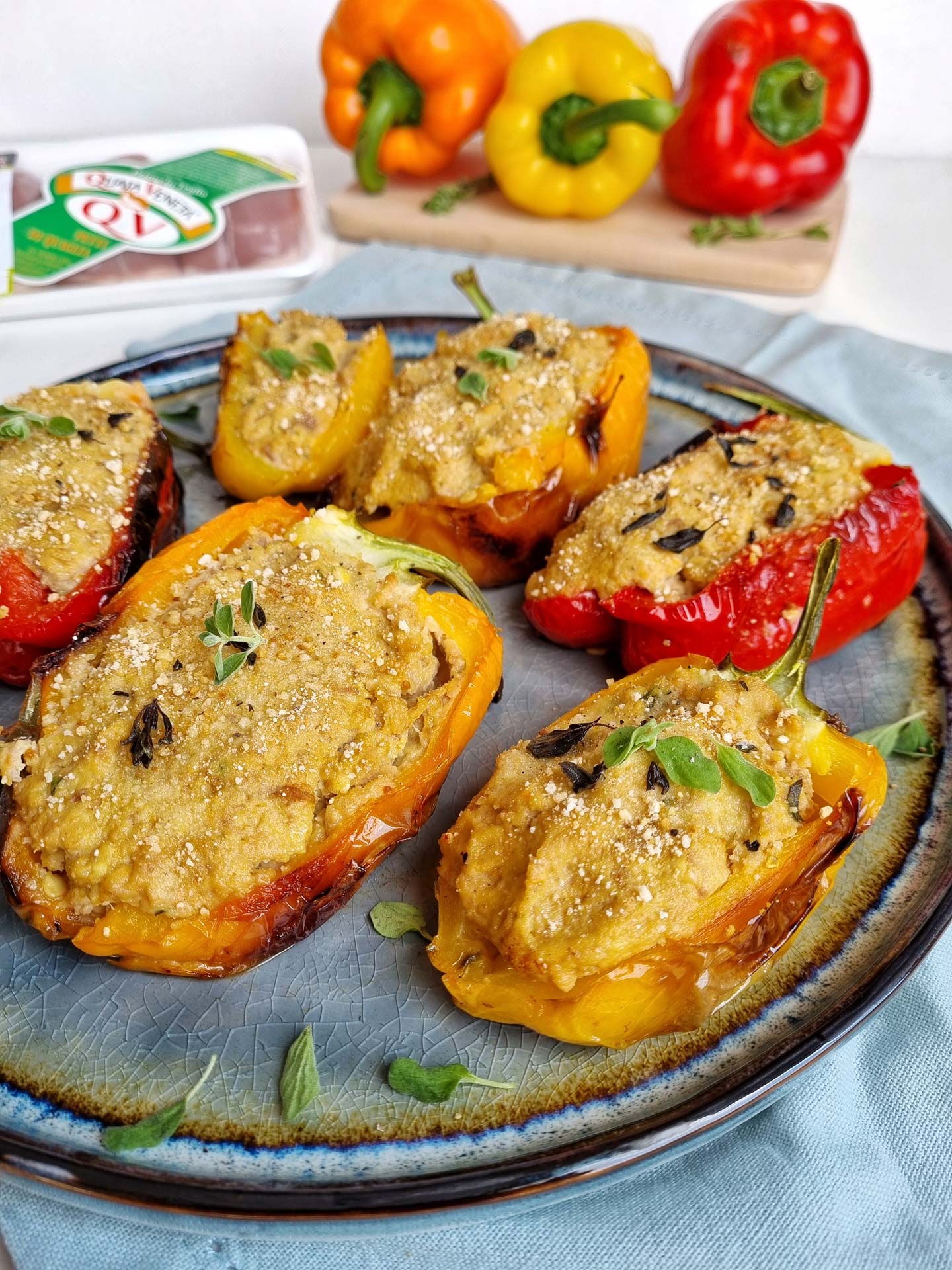 - Bestreuen Sie die Paprikaschoten auf der Oberfläche mit Paniermehl und backen Sie sie bei 180° 30 Minuten lang. Decken Sie die Schale für die erste Viertelstunde mit Alufolie ab und nehmen Sie sie dann ab, damit die Oberfläche weitergaren und braun werden kann.