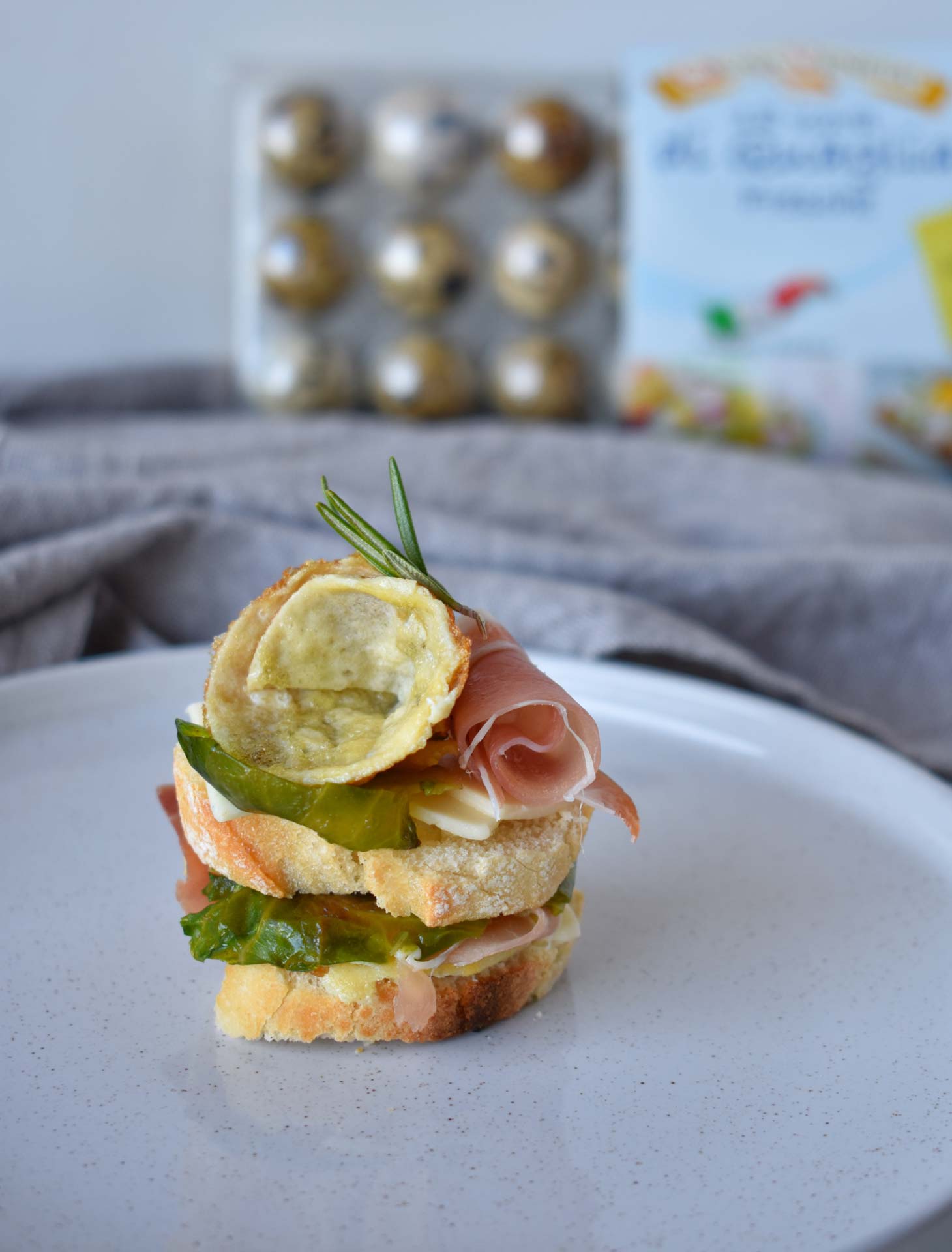 Millefeuille mit Wachteleier-Omelett und Schinken