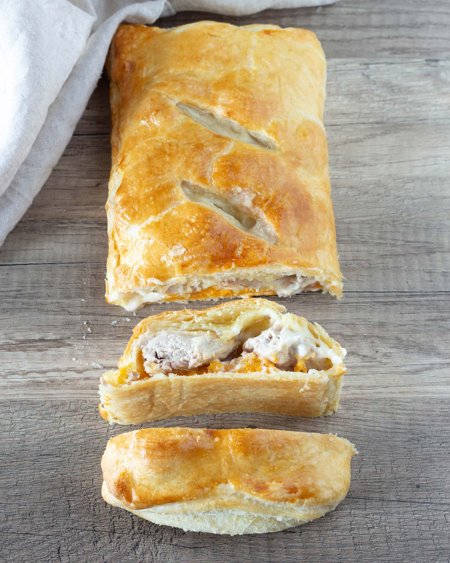 - Mettere al centro del rotolo di pasta sfoglia le fette di taleggio, la zucca e infine i petti di quaglia. Chiudere a portafoglio e praticare dei tagli in superficie.